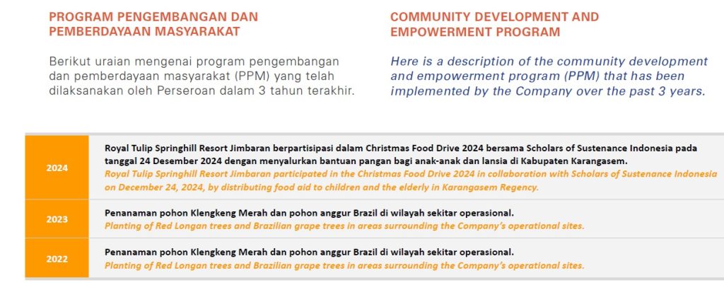 The company acknowledges that a company’s performance is measured not only from economical aspect, but also social and environmental performance. This awareness is based on the realization that the efforts to achievecompany’s objective is also by establishing harmonious and beneficial relationship with the environment, people and customers. This relationship is established through an ideal, beneficial and appropriate CSR program